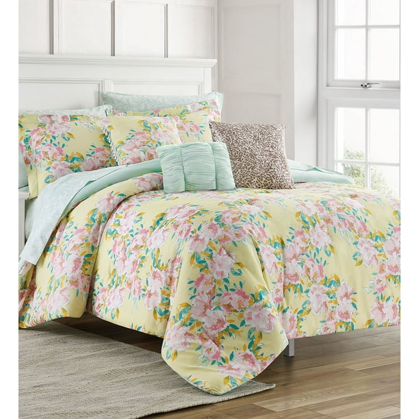 Sophia Floral Yellow Aqua 10 Piece Comforter Set Full Queen Walmart Com Walmart Com