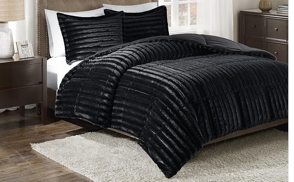 Logan Black Faux Fur Comforter Set Queen